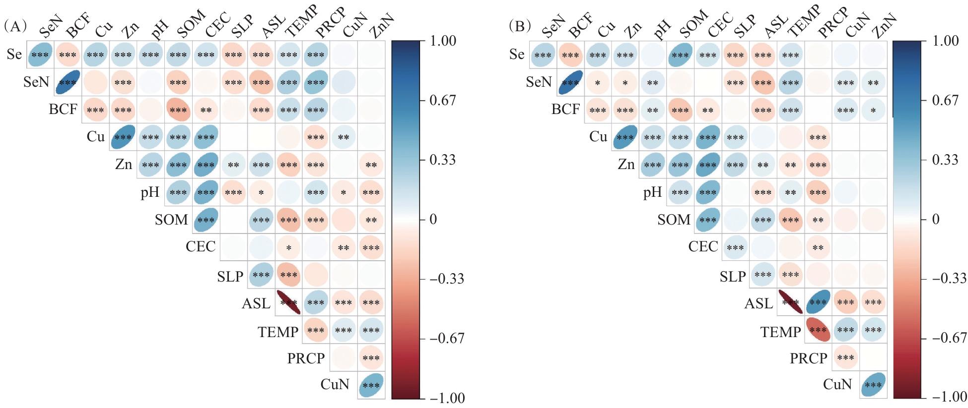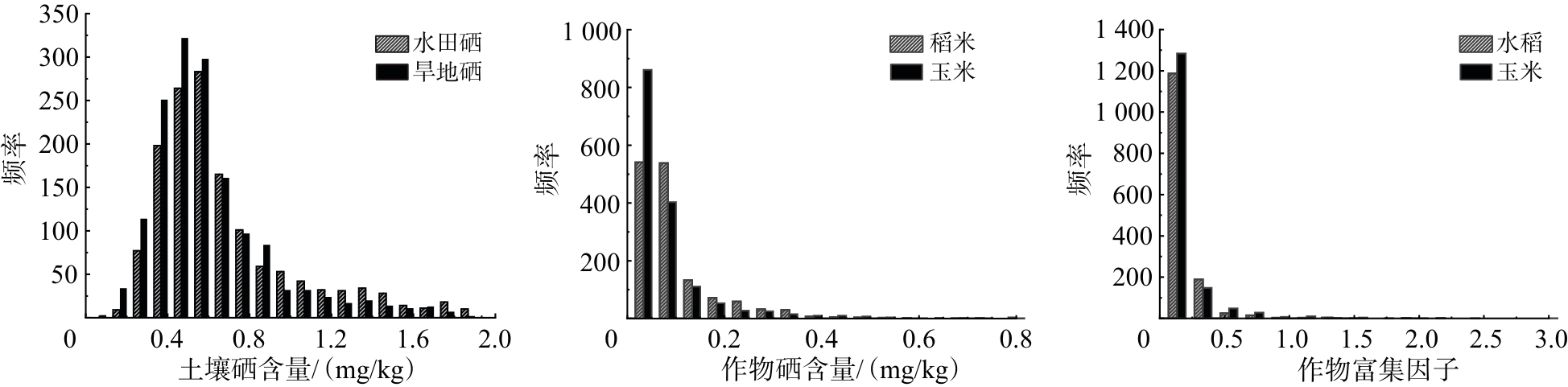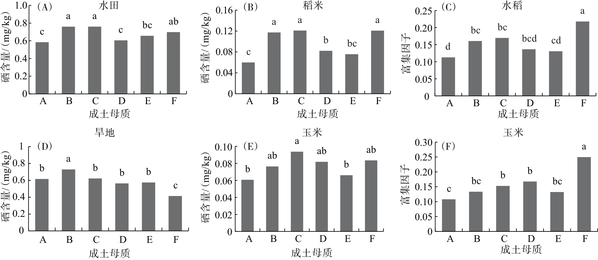 6种成土母质的水田平均硒含量在0.58~0.76 mg/kg,稻米平均硒含量在0.06~0.12 mg/kg,稻米平均富集因子在0.11~0.22;旱地平均硒含量在0.41~0.73 mg/kg,玉米平均硒含量在0.06~0.09 mg/kg,玉米平均富集因子在0.11~0.25(