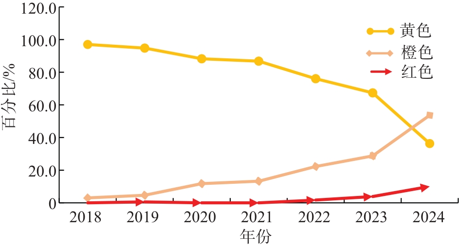 | 预警级别 | 状态 | 2018年 | 2019年 | 2020年 | 2021年 | 2022年 | 2023年 | 2024年 | 2018—2023年占比/% | 2024年占比/% |