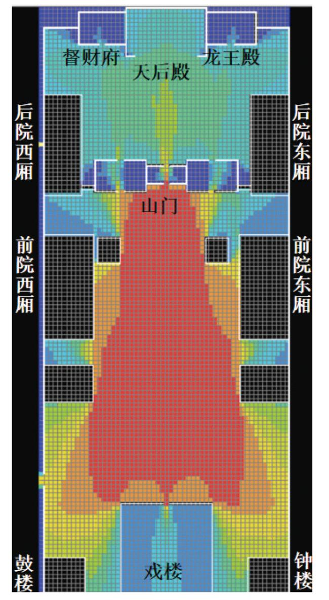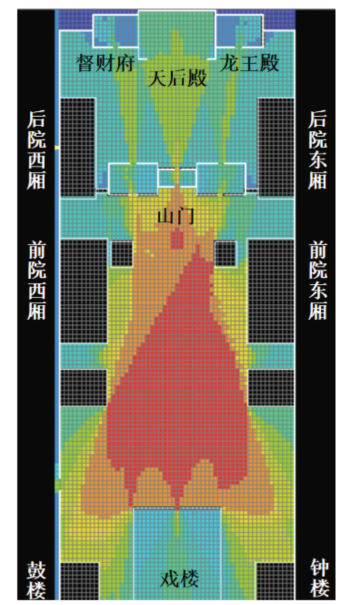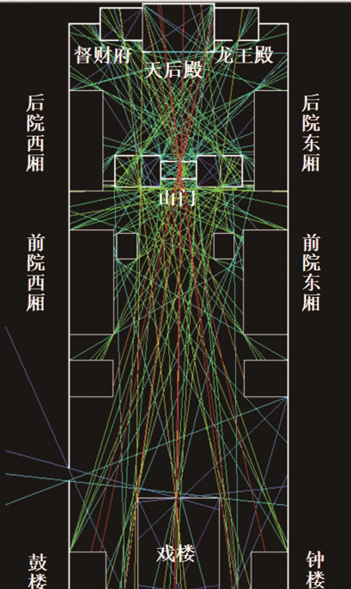 为量化青岛民俗博物馆的空间格局,进而分析游人的行为模式,本研究以风景园林三元论(ESA)为理论框架,运用空间句法理论的视域分析与轴线分析方法,定量解析青岛民俗博物馆的环境生态(E)格局与空间形态(S)特征,研究与之适配的潜在行为活动(A)模式,阐释了E、S与A三者间的耦合机制。结果表明,“戏楼—山门”区域的视觉整合度、轴线整合度较高,为视觉与交通联系的双核心区域,承担集散、观演及社交功能,厢房、督财府、龙王殿等整合度低的区域私密性较高,承担了相对安静的静默瞻仰与办公功能,形成了以“山门→主殿”为轴向的空间递进序列。本研究结果为传统祠庙建筑遗产的保护与适应性再利用提供了参考,验证了ESA理论与空间句法相结合构建的量化分析框架在历史空间研究中的有效性。
