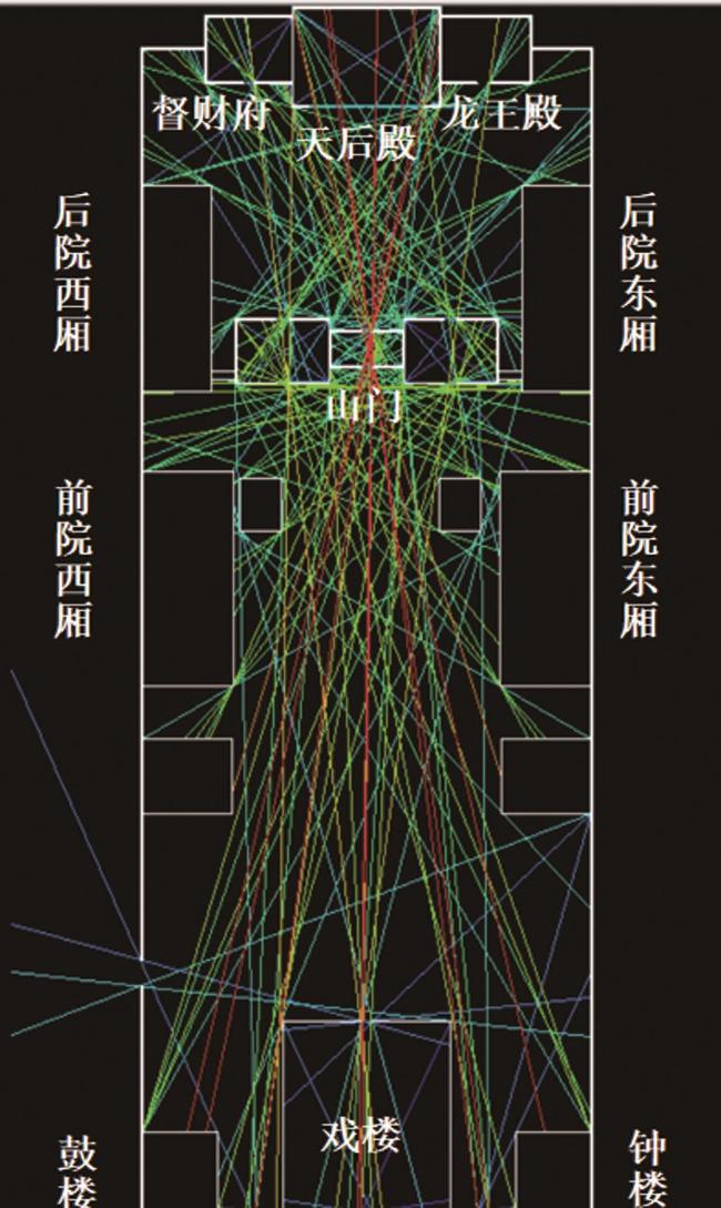 To quantify the spatial layout of the Qingdao Folklore Museum and further analyze the behavioral patterns of visitors, this study took the ESA theory as the theoretical framework and employed the perspective analysis and axis analysis methods of spatial syntax theory to quantitatively analyze the environmental ecology (E) layout and spatial form (S) characteristics of the Qingdao Folklore Museum, and deduced the corresponding potential behavioral activity (A) patterns. The coupling mechanism among E, S and A was expounded. The results showed that the “opera stage - mountain gate” area had a relatively high degree of visual integration and axial integration, serving as a dual core area for visual and transportation connections, undertaking functions such as gathering and distribution, performance viewing, and social interaction. Areas with low integration, such as the side rooms, Ducaifu and Longwangdian, had higher privacy and undertake relatively quiet silent admiration and office functions, forming a spatial progressive sequence with “mountain gate-main hall” as the axis. The results of this study provide a reference for the protection and adaptive reuse of traditional temple architectural heritage, and verify the effectiveness of the quantitative analysis framework constructed by combining ESA theory with spatial syntax in the study of historical space.