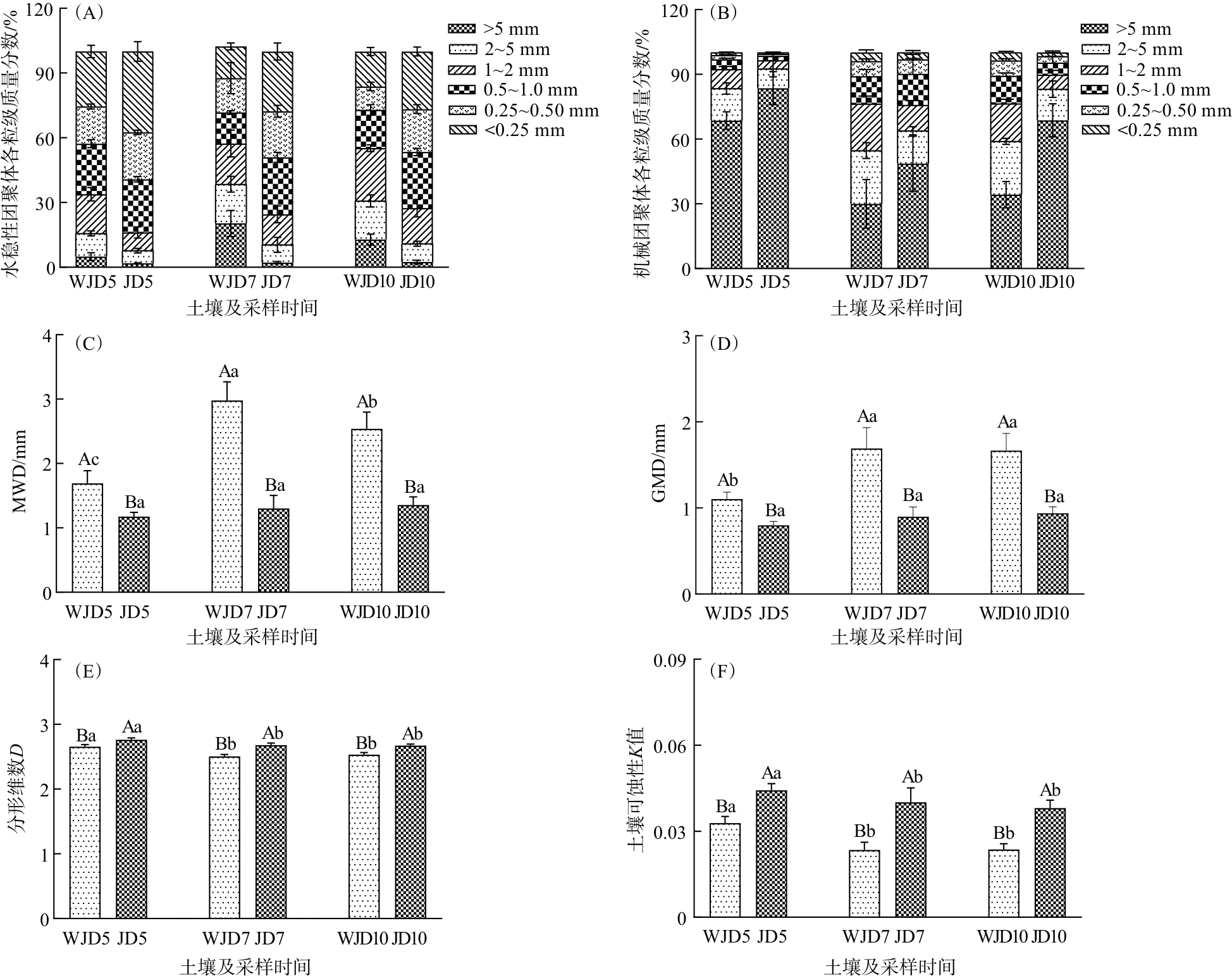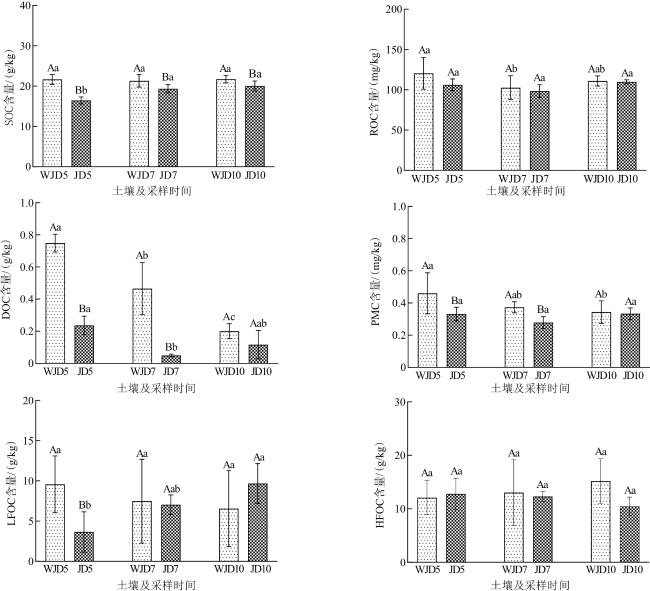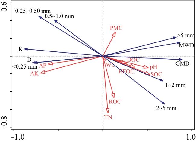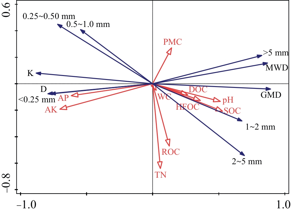 To investigate the effects of long-term tillage on soil aggregates, soil organic carbon (SOC), and its fractions in black soil regions, this study used no-tillage and long-term tilled soils in spring, summer, and autumn as research objects. Dry sieving and wet sieving methods were employed for aggregate fractionation and determination of stability parameters. Conventional analytical methods were used to measure SOC fractions and other physicochemical properties, followed by redundancy analysis (RDA) and Pearson correlation analysis. The results showed that: (1) After long-term tillage, the mass fraction of large-sized (>1 mm) water-stable aggregates, mean weight diameter (MWD), and geometric mean diameter (GMD) were all lower than those in no-tillage soil, while the fractal dimension (D) and soil erodibility (K) value were higher. With seasonal changes, the mass fraction of large-sized water-stable aggregates, MWD, and GMD in long-term tilled soil gradually increased. (2) Long-term tillage reduced the contents of SOC, readily oxidizable organic carbon (ROC), dissolved organic carbon (DOC), and potentially mineralizable carbon (PMC) compared with no-tillage soil. Seasonally, SOC and light fraction organic carbon (LFOC) contents in long-term tilled soil showed a gradual increasing trend. (3) After long-term tillage, soil moisture content and pH were lower than those in no-tillage soil, while available phosphorus (AP) and available potassium (AK) contents were higher. With seasonal variations, soil moisture content in long-term tilled soil first decreased and then increased; pH showed a gradual decreasing trend; total nitrogen (TN), AP, and AK contents initially increased and then decreased. (4) Pearson correlation analysis revealed that SOC was positively correlated with LFOC; DOC was positively correlated with PMC, ROC, and SOC; the mass fraction of large-sized water-stable aggregates, MWD, and GMD were positively correlated with soil pH and SOC; both pH and moisture content were positively correlated with DOC, ROC, and PMC contents, while AP and AK were negatively correlated with DOC. RDA results indicated that the environmental interpretations of AK, AP, SOC, and pH were 30.4%, 23.2%, 18.8%, and 16.4%, respectively. Collectively, long-term tillage tends to cause soil compaction, reduce soil aggregate stability and the contents of SOC and its fractions. Available potassium, soil moisture content, and pH are the main environmental factors affecting changes in soil aggregates and organic carbon fractions.