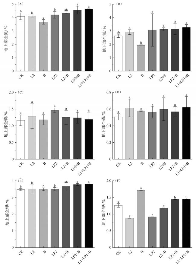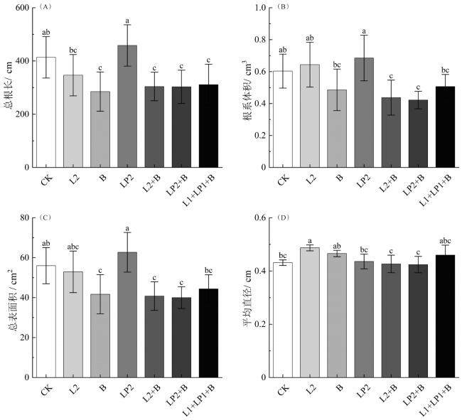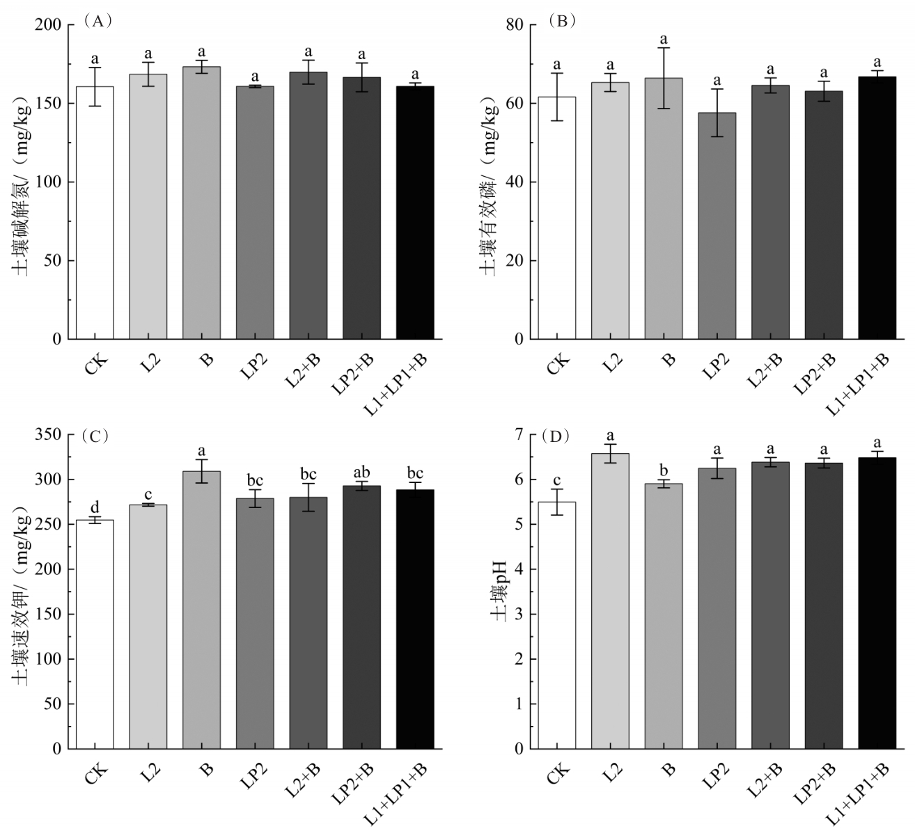 Through pot experiments, the effects of single application of lime based conditioners and combined application of biochar on the physical and chemical properties of fallow soil, and the growth and nutrient absorption of wheat seedlings were investigated, aiming to provide references for rapidly reducing acidity, improving quality, and enhancing crop yield in refarmed acidified soil. The results showed that compared with the control (without the application of conditioner), the application of conditioners in acidic soil (pH 5.35) increased the soil alkaline hydrolyzable nitrogen, available phosphorus, and available potassium content, with increases of 0.15%-7.93%, 2.38%-8.34% and 6.68%-21.33%, respectively. It also increased the fresh and dry root weight of wheat on acidic soil, with increases of 2.78%-15.63%, 1.14%-15.23%, respectively. The total root length, root volume and total surface area of single application of limestone powder increased 10.75%, 13.65% and 11.98% compared to CK. The application of lime conditioner alone and combined with biochar increased the total nitrogen, total phosphorus, and total potassium content in the above-ground wheat, with increases of 2.78%-12.92%, 2.27%-7.70% and 5.37%-9.44%, respectively. The increase in total nitrogen and total phosphorus content in wheat roots ranged from 18.82%-24.27%, 12.24%-22.37%, respectively. The application of biochar alone had a promoting effect on soil alkaline nitrogen and available potassium content; the combination of lime based conditioners and biochar could promote the increase of soil available phosphorus content, wheat biomass, and soil nitrogen, phosphorus, and potassium nutrients.