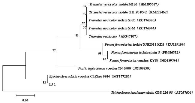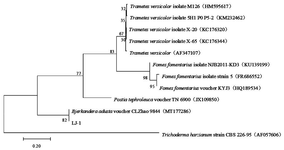 The endophytic fungi was isolated and screened from pepper variety Yangjiaojiao, and identified by morphological observation and sequence analysis. The effects of different carbon sources (glucose, maltose, sucrose, lactose and soluble starch), nitrogen sources (ammonium chloride, ammonium sulfate, potassium nitrate, yeast extract and peptone), accelerators (Tween-80 and oleic acid), and pH (5.0-12.0) on the growth of this strain were investigated. The results showed that the front side of the endophytic fungi mycelium isolated from the pepper was white fluffy-like, no pigment production, air growth and loose texture. Septate, spore-bearing oval, apical obtuse; The gene sequence size was about 515 bp, and it was on the same branch as Bjerkandera adusta, which can be preliminarily identified as Bjerkandera adusta and named Bjerkandera adusta LJ-1. The optimal carbon source for the growth of the bacteria was sucrose, the optimal nitrogen source was yeast extract, the optimal accelerator was oleic acid, and the optimal pH was 6.0-8.0. Under the above conditions, the mycelium growth rate was ideal and showed a good growth state. The results provide a reference for further study of Bjerkandera adusta.