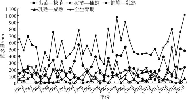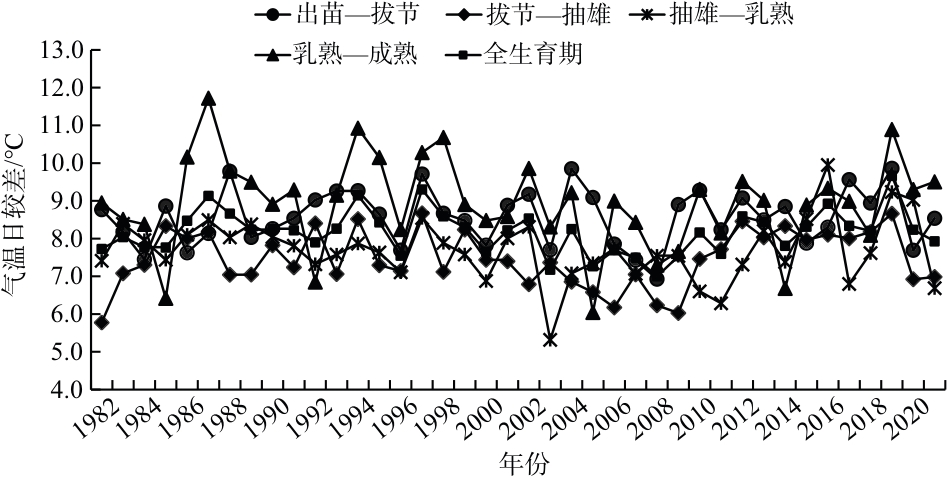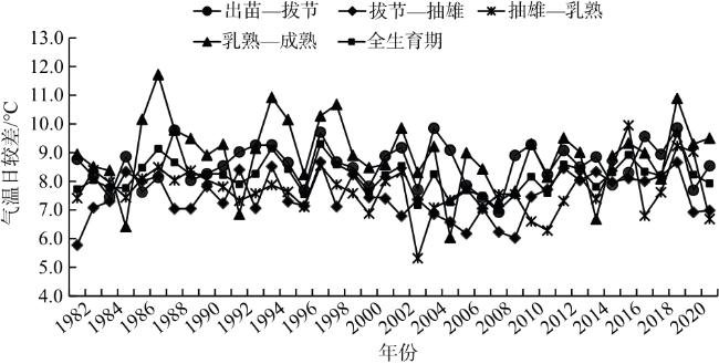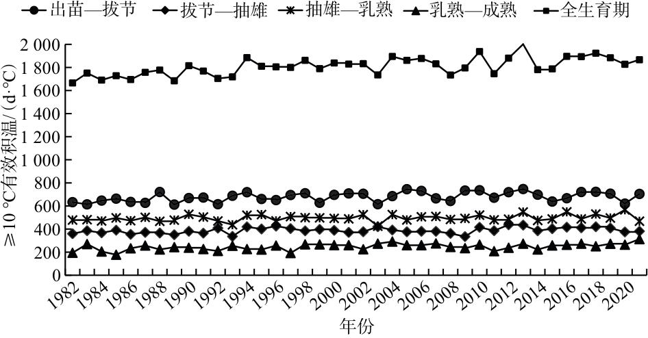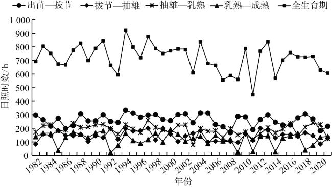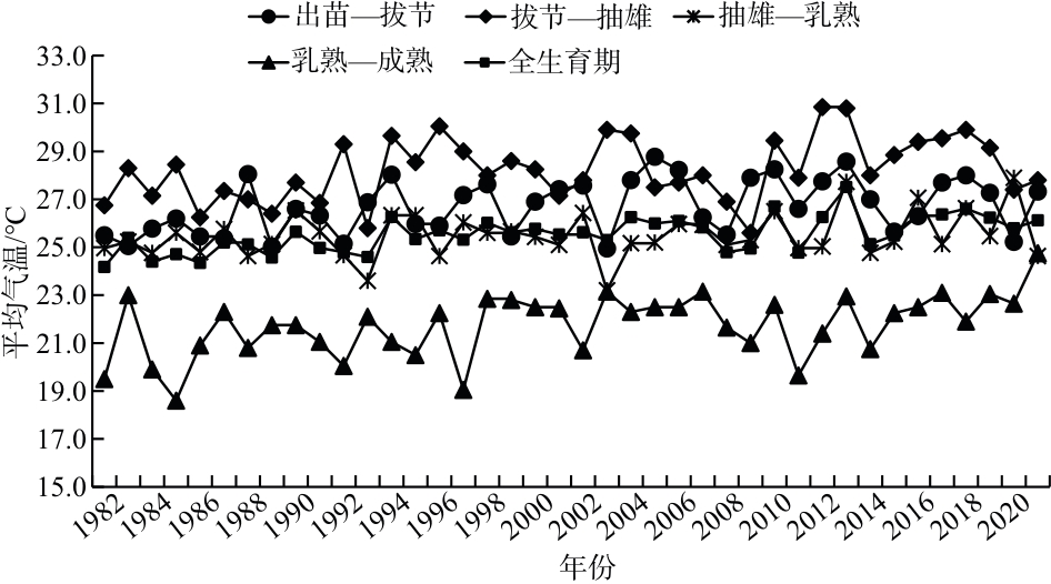 [14],但针对气候变化对淮北地区夏玉米不同生育阶段生长及产量影响的研究相对较少。本文基于1982—2021年安徽淮北市夏玉米生育期的气象数据和产量数据,分析了该地区夏玉米不同生育期的气候变化特征及其对产量的影响,为充分开发利用气候资源和提高粮食产量提供参考。