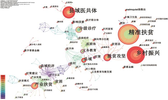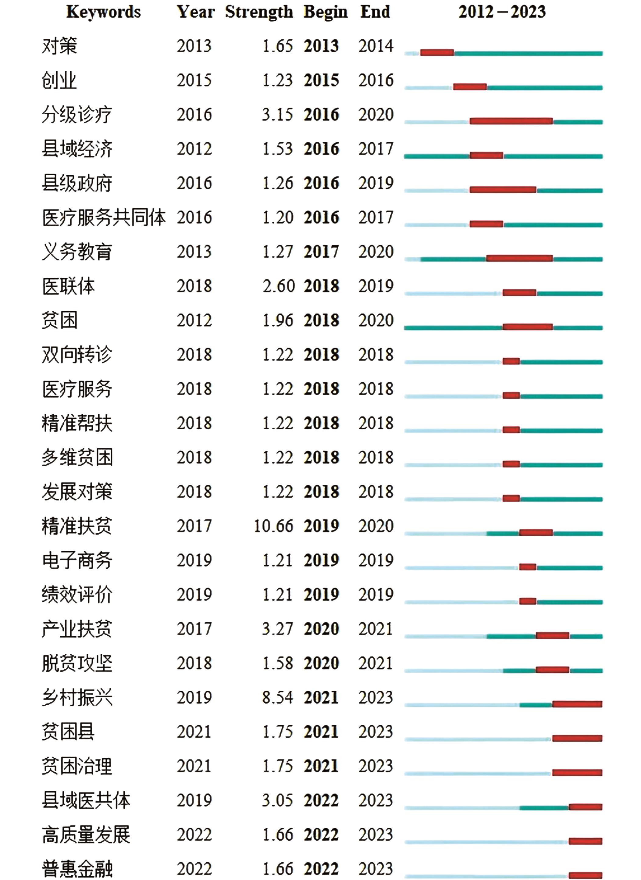 | 1 | 乡村振兴 | 乡村振兴(15.67,1.0E-4);脱贫攻坚(13.6,0.001);县域医共体(7.95,0.005);精准扶贫(4.5,0.05);分级诊疗(3.93,0.05) | 2019 | 31 |