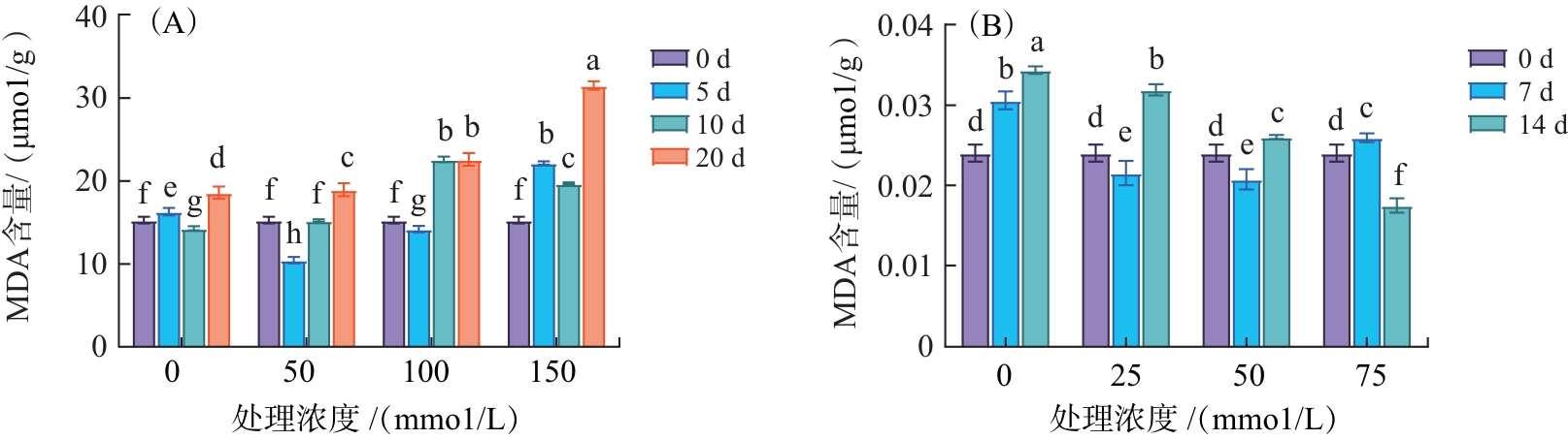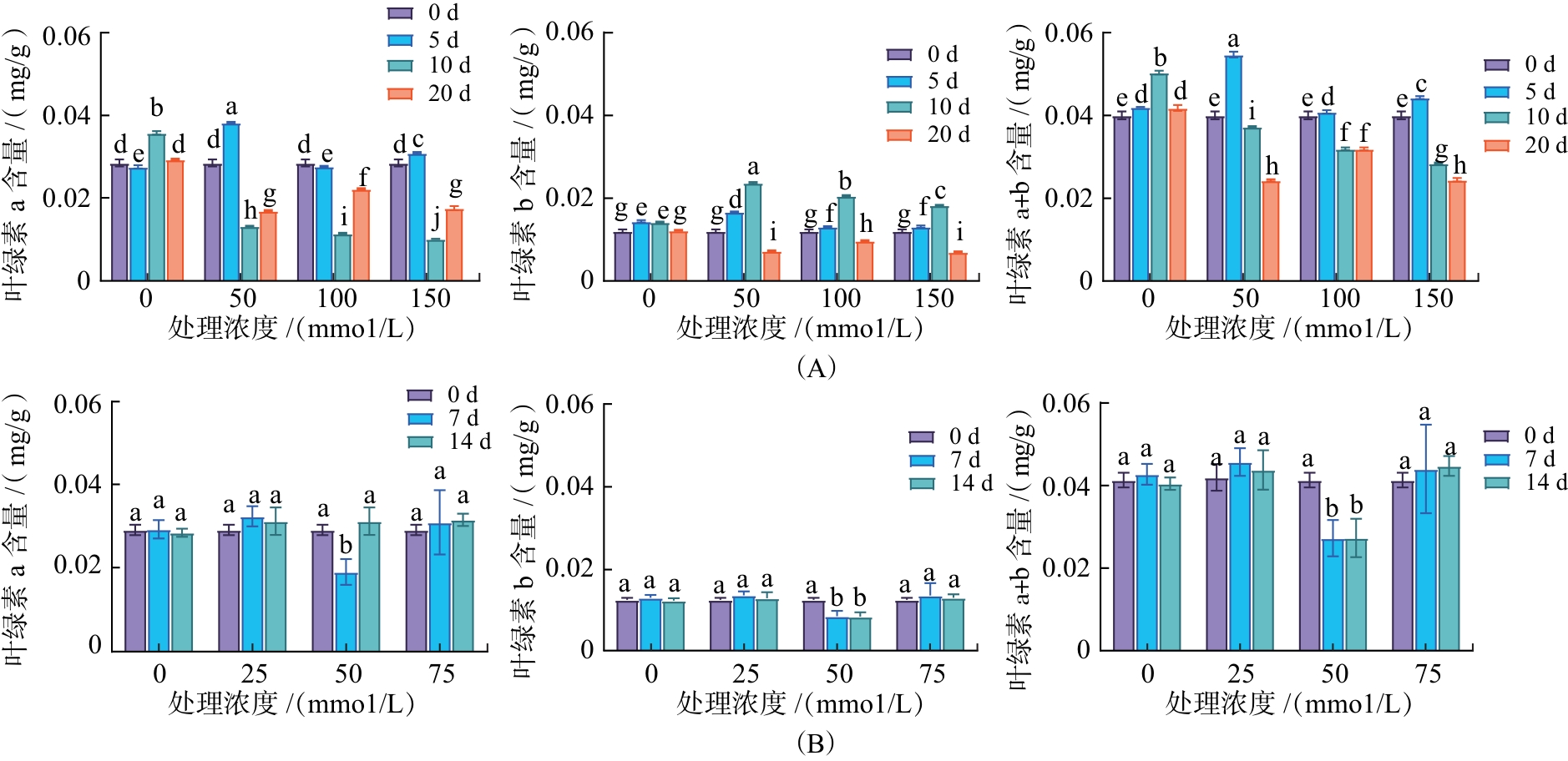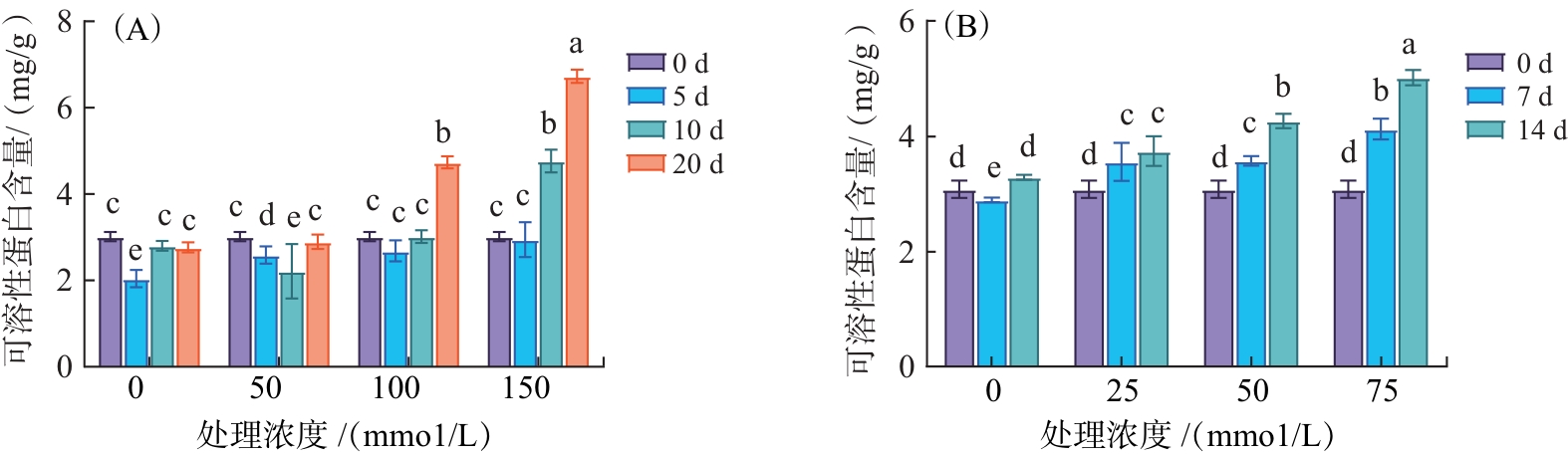 (A)、(B)分别为土培、水培;不同小写字母表示处理间差异在0.05水平具有统计学意义。
