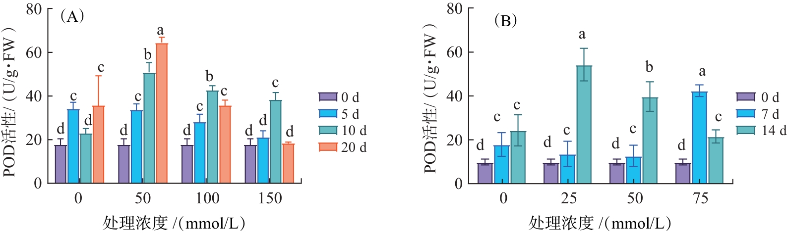 滇杨叶片在土培及水培盐胁迫处理中的POD活性变化